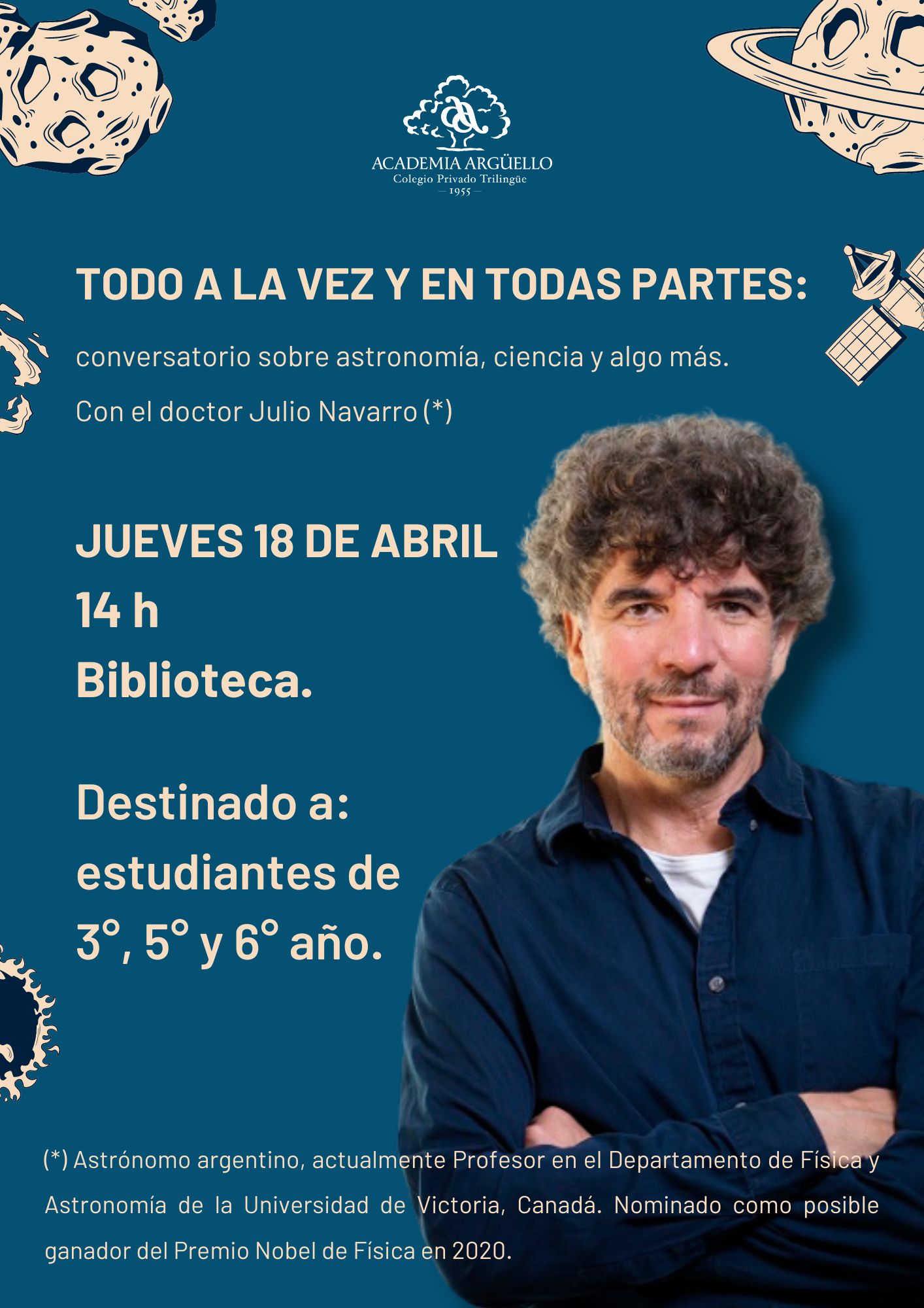 Conversatorio sobre astronomía, ciencia y algo más, con el doctor Julio Navarro, astrónomo argentino, profesor en el departamento de Física y Astronomía en la Universidad de Victoria, Canadá. Nominado como posible ganador del Premio Nobel de Física 2022. Destinado a estudiantes de 3°, 5° y 6° año